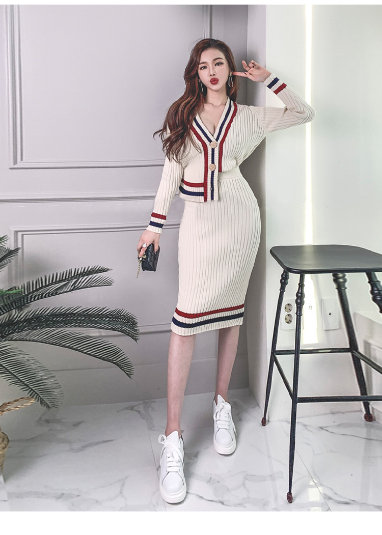 Contrast Striped V-neck Knit Cardigan Long Sleeve Sweater Wrapped Hip Wool Knit Skirt